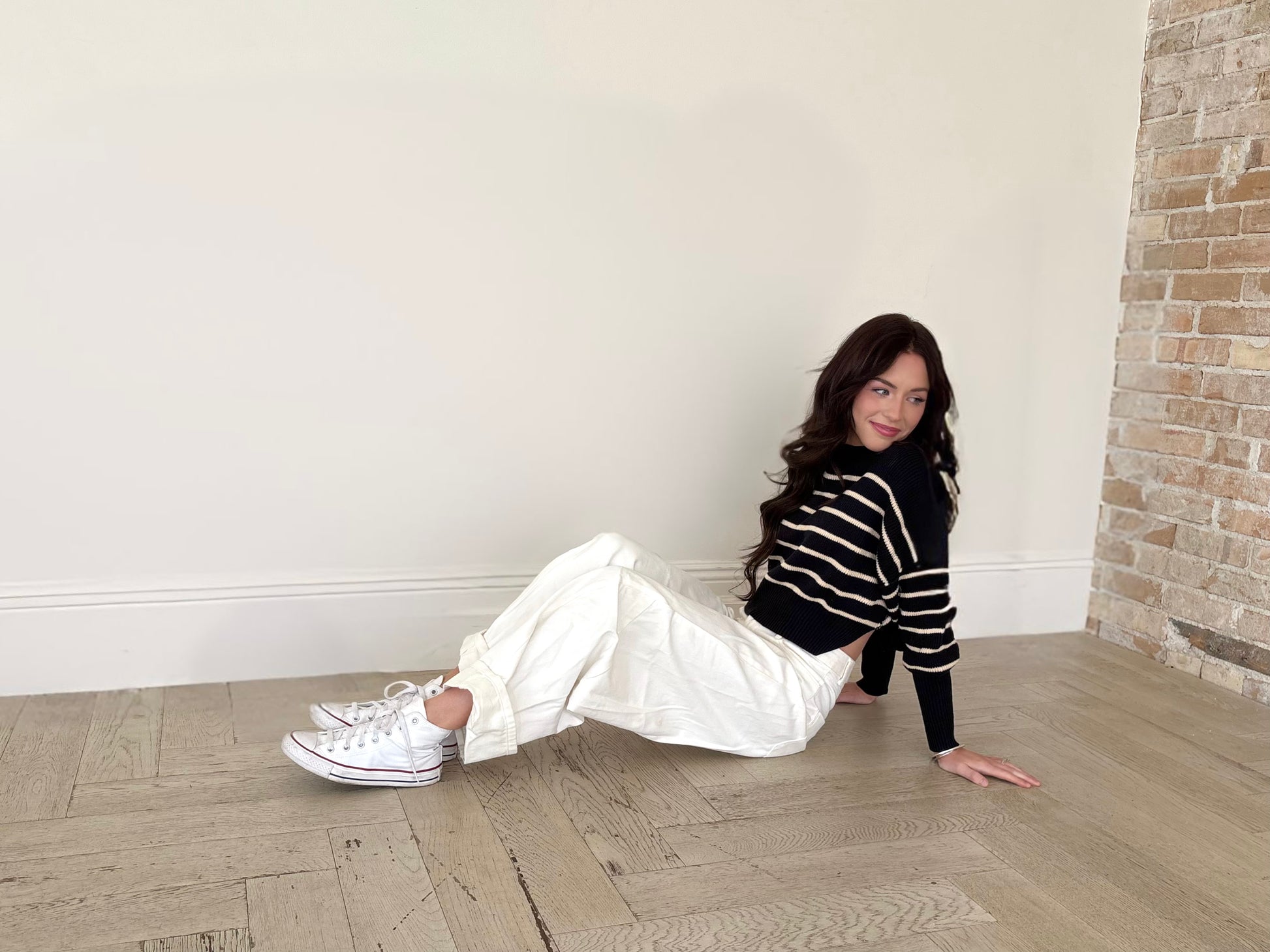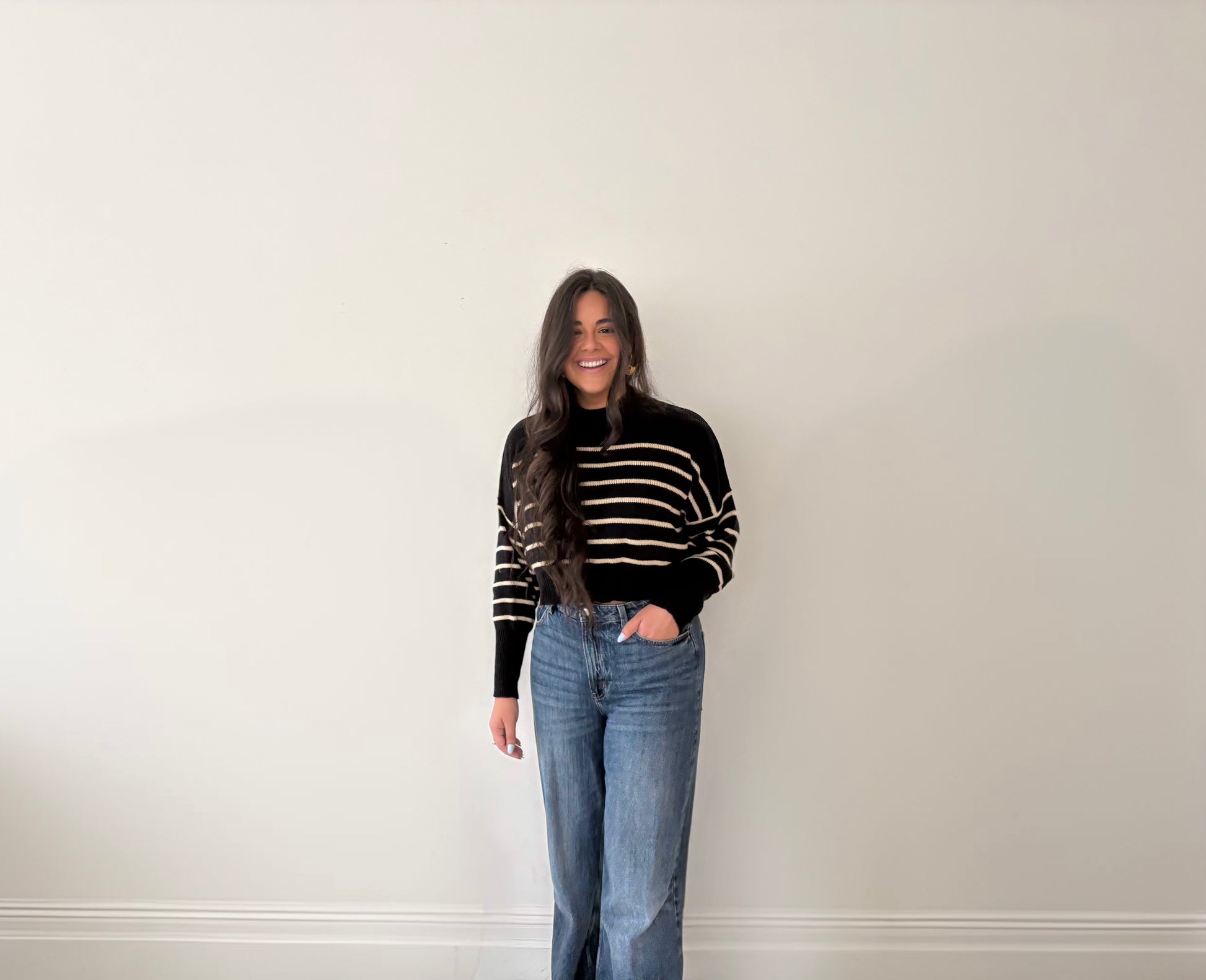 Long Sleeve Black Sweater With Cream Stripes. Cropped Fit.
